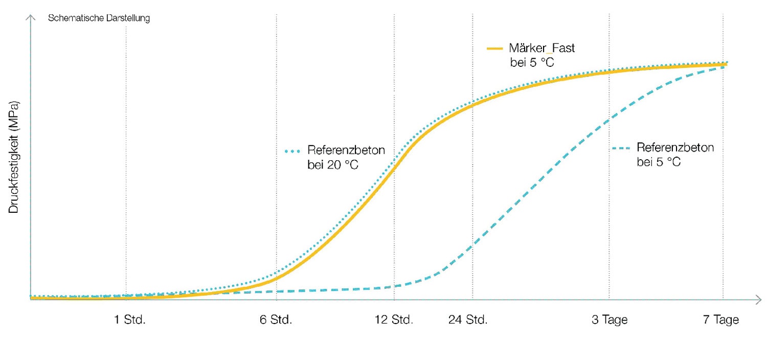 Märker_Fast verleiht dem Baustoff bei niedrigen Temperaturen den nötigen Kick um die Zementhydratation/Wärmeentwicklung zu starten, bevor der Beton unter 5 °C abkühlt und die Erhärtung ausbleibt. So wird auch bei Frost eine zuverlässige Betonerhärtung möglich. Die bei niedrigen Temperaturen auftretende, unregelmäßige, fleckige Dunkelverfärbungen an Betonoberflächen kann durch den Einsatz von Märker_Fast auf Sichtbetonoberflächen deutlich reduziert werden.